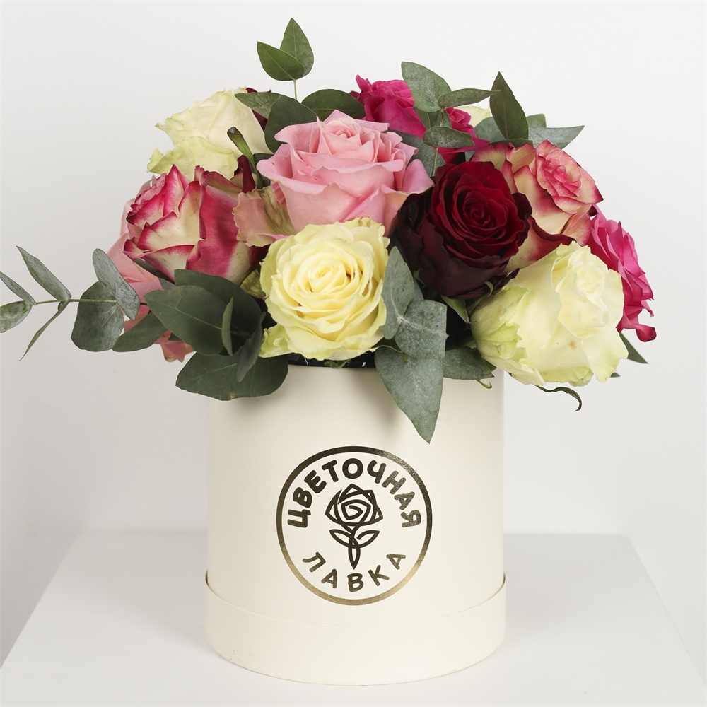 Композиция в шляпной коробке с розой Эквадор микс с игрушкой "Парма" купить в Перми за 5 855 руб.